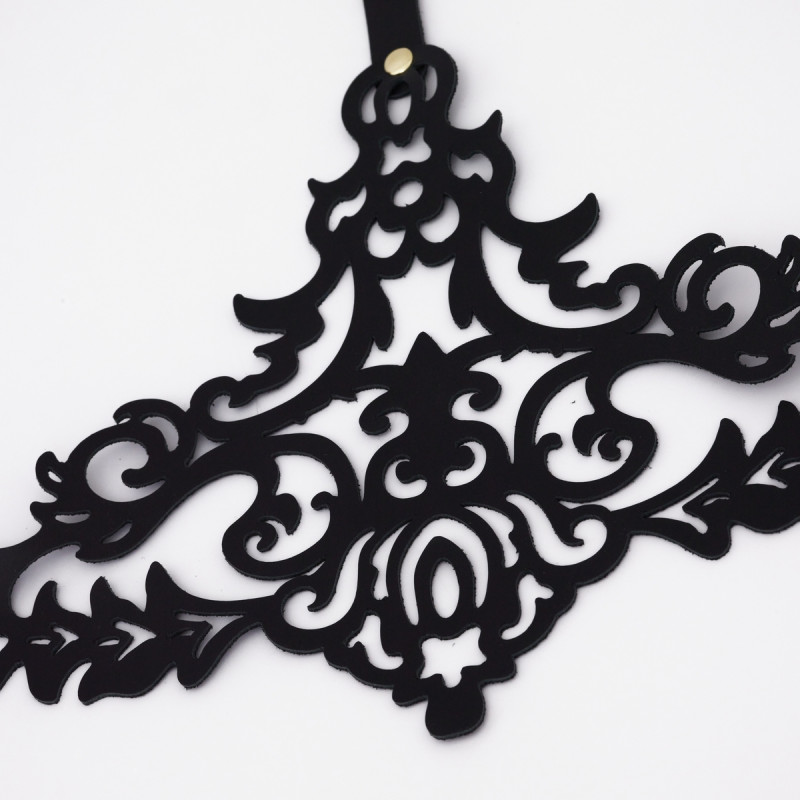 Эта резная портупея изготовлена из черной натуральной кожи и дополнена золотой фурнитурой высокого качества. Ремешки соединены между собой кольцами и клепками.